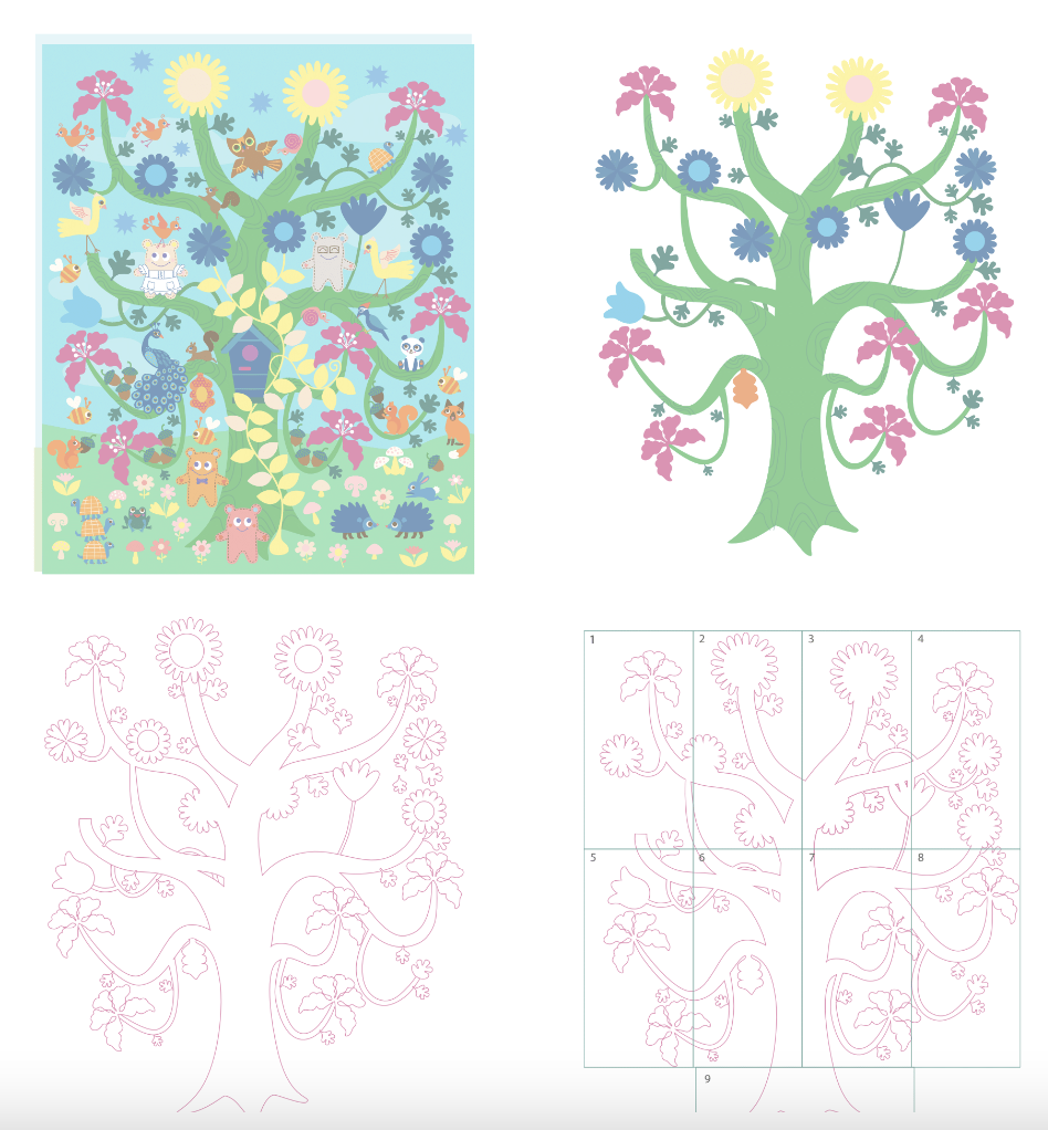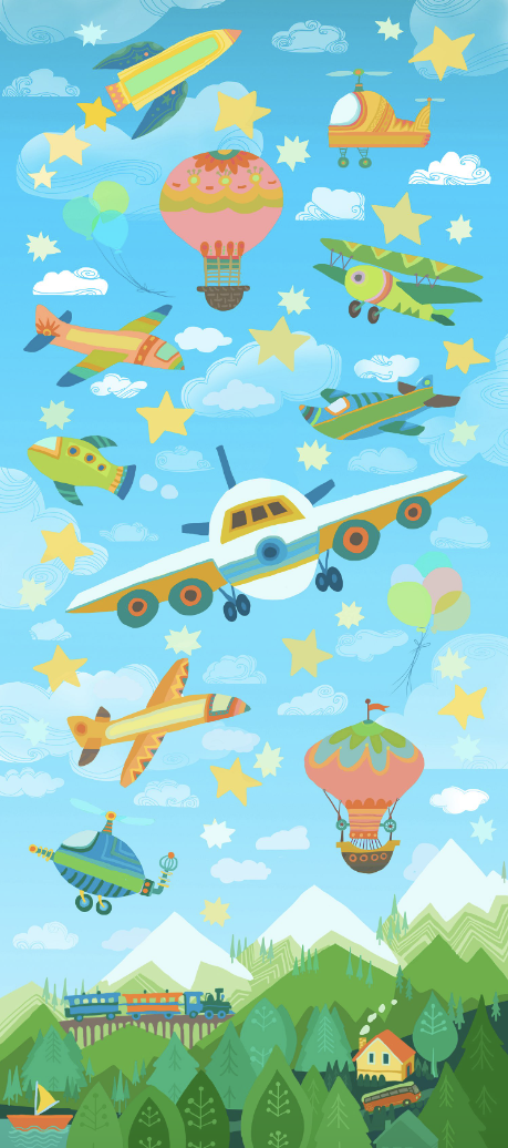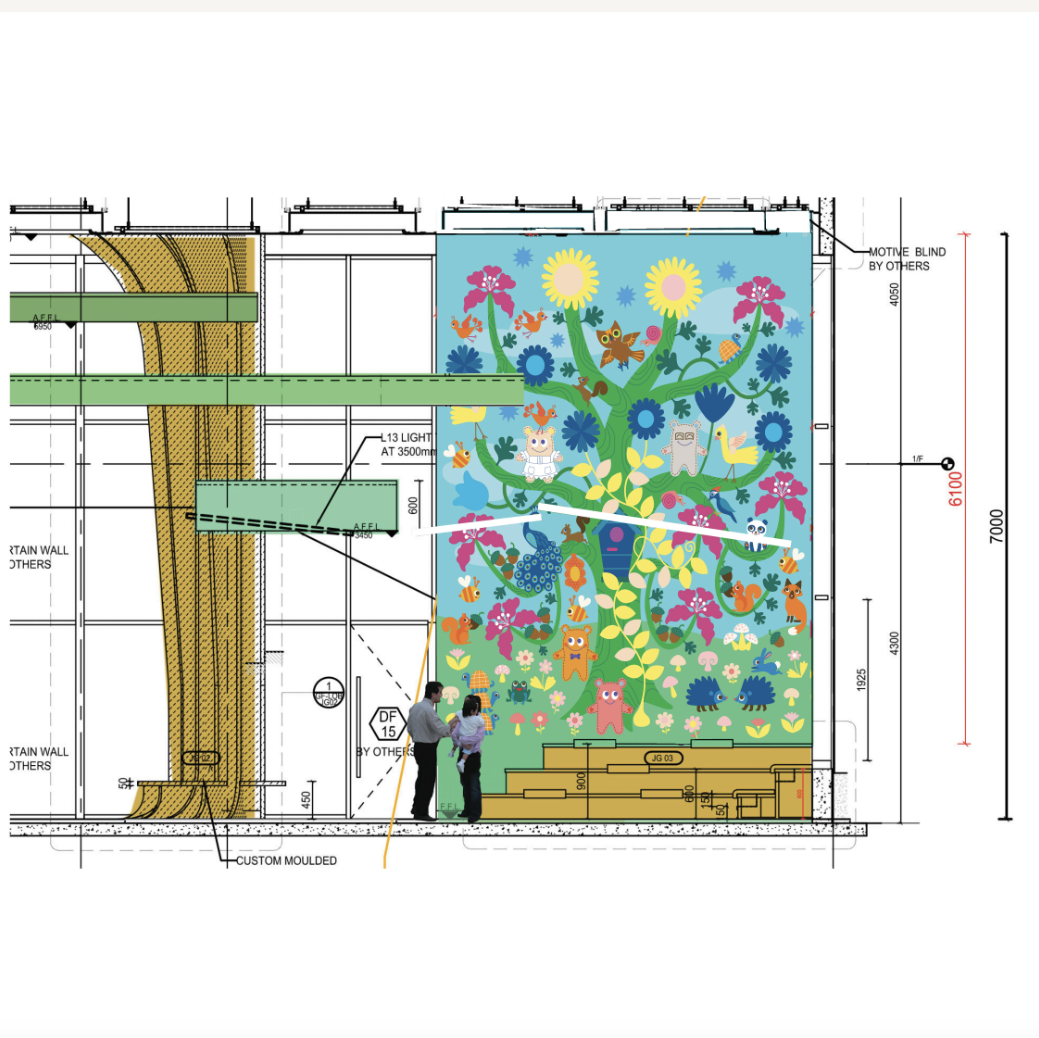 As you’ll see below, our designs included a vibrant two-story tree filled with 2D animals, insects, vegetation, and playful friends. Another large 2D installation took imagination to the skies using images of planes, rockets, balloons, and helicopters. Donor names were creatively woven throughout the art, shining a light on their generosity.